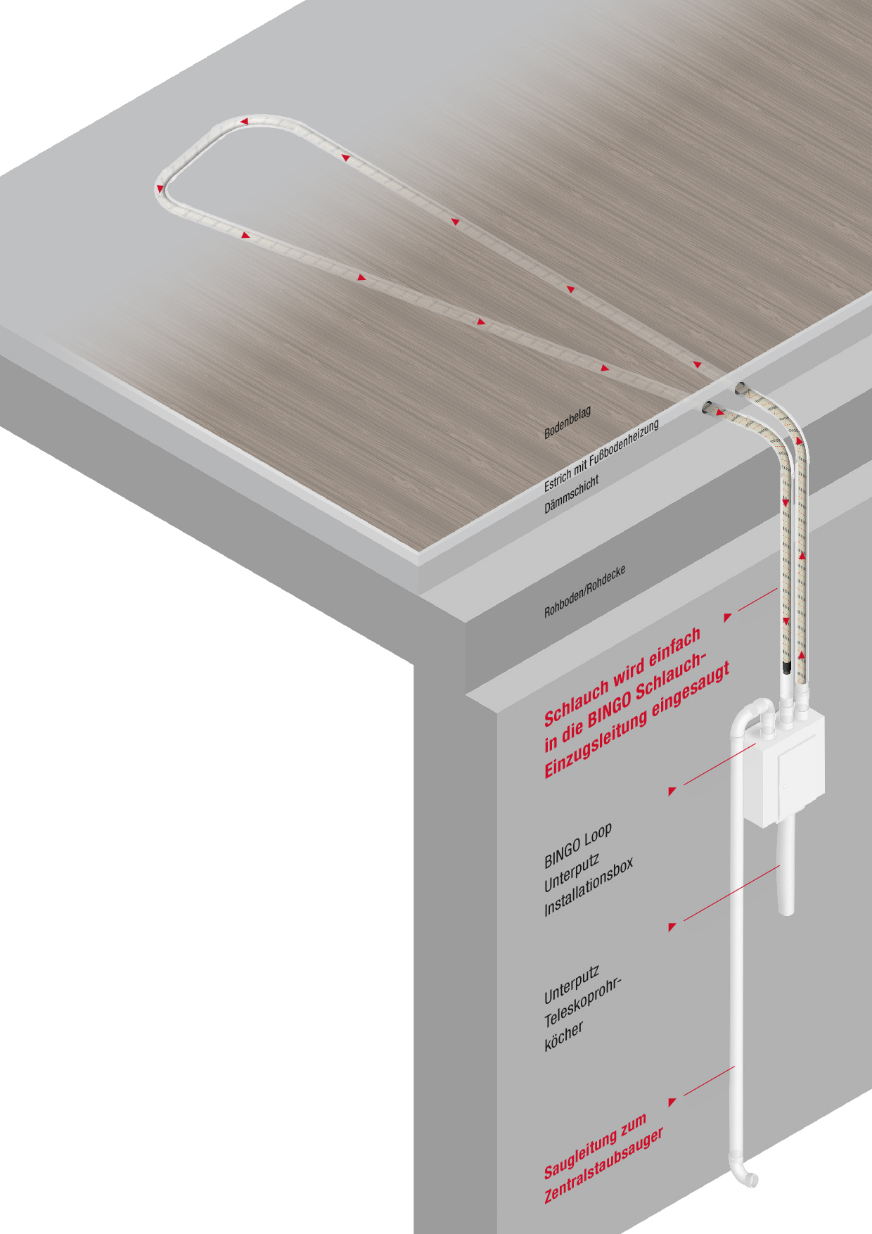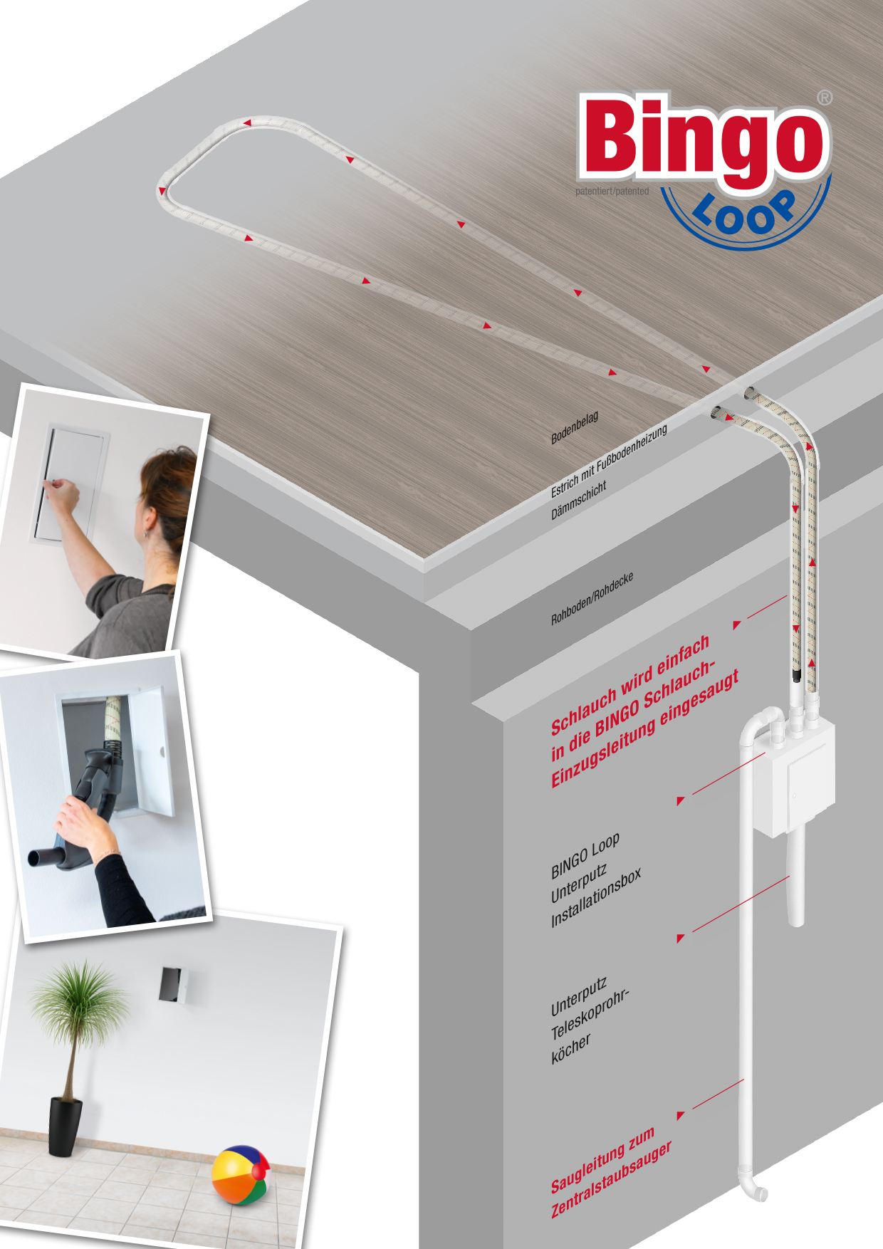 Mit dem BINGO loop wird ein alter Traum wahr. Der Saugschlauch aus der Wand ist in Sekundenschnelle bereit und ebenso schnell wieder verstaut. Und das Beste: Das komplette Zubehör in Form von Bodendüse, Teleskoprohr und 3-in-1-Düse ist direkt hinter dem kleinen Türchen deponiert und jederzeit griffbereit.